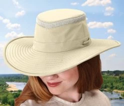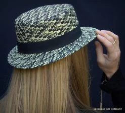 This beige flat brim fedora has a tan grosgrain bound edge matching the 1 inch wide grosgrain ribbon hat band.