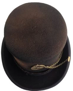 Distressed-Look wool felt Steampunk top hat with chains and Penny-Farthing (High Wheeler) charm.