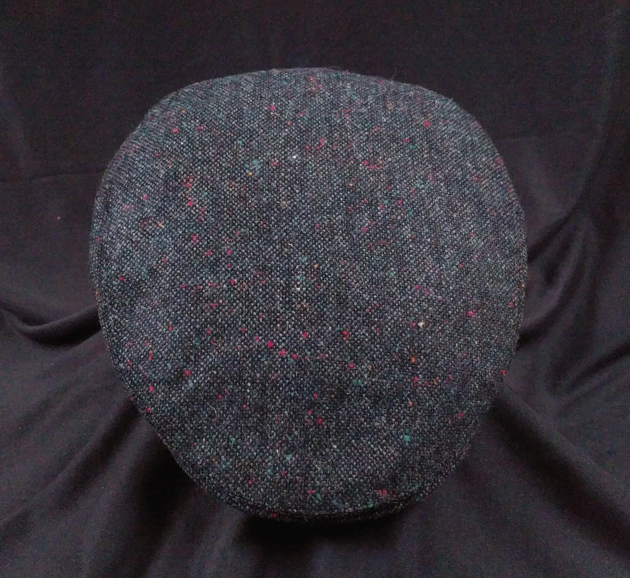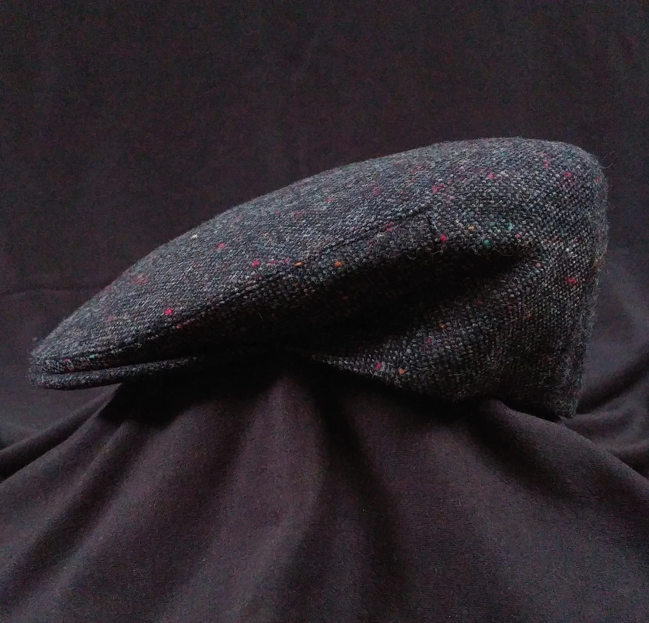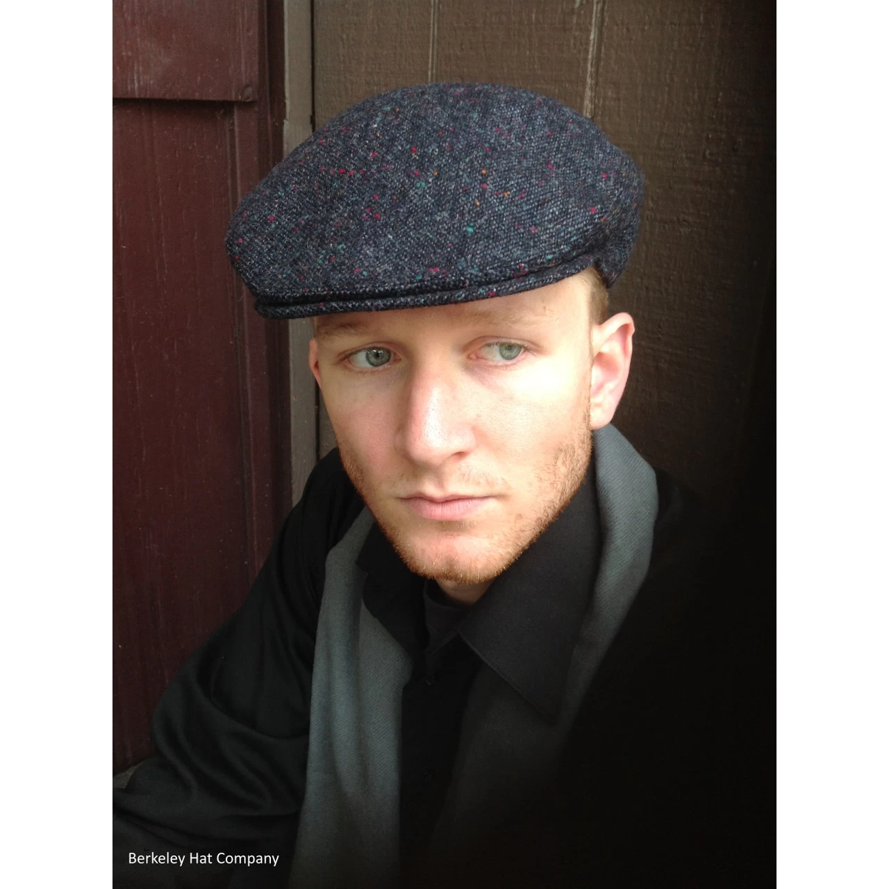 Fine weave Donegal tweed County cap, also called an Ivy cap, in a dark denim blue with color flecks.