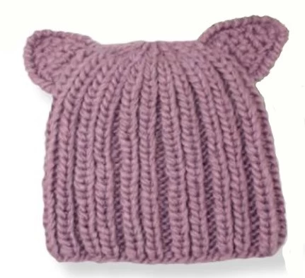 Knit pussy cat hat in mauve pink.
