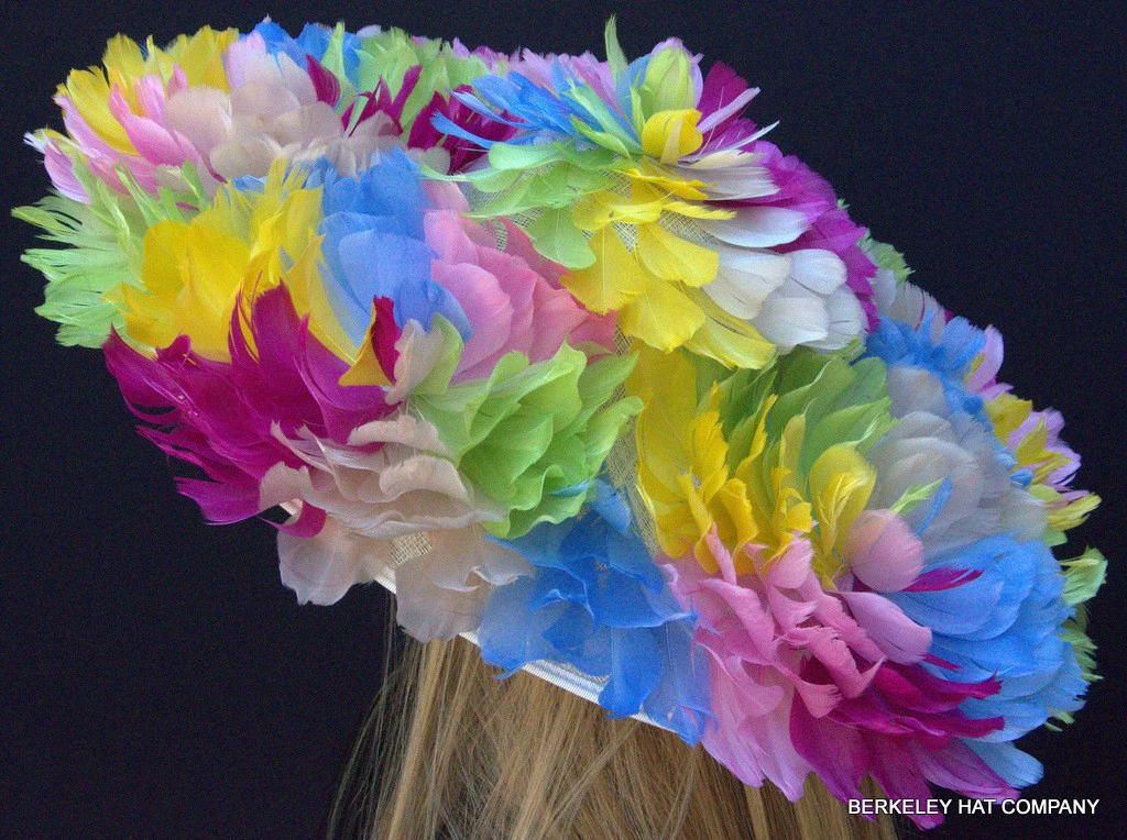 Large dish fascinator decorated with neatly arranged feathers of blue, green, yellow and three shades of pink.