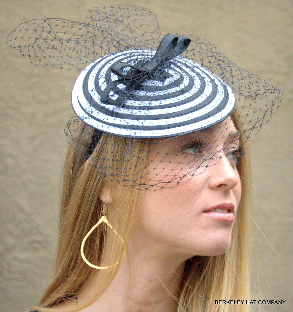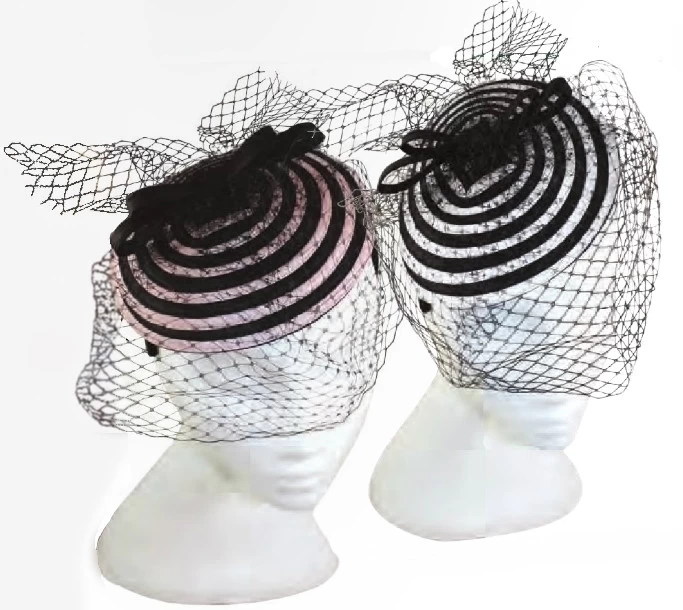 These sewn ribbon fascinators with a 7 inch base are topped off with black veiling and a little double bow.